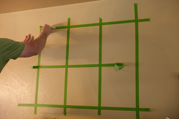 I bought an old six-pane wooden window for $10 at a consignment store. I knew I was going to use it for photos, and it turns out that the panes are just about the right size for the dictionary pages. My plan was to simply tack the pages on the wall with decorative upholstery tacks and then hang the window on top of it. The trick is figuring out where to pin each photo. I hate doing anything that requires measuring and calculation, so I hung up the window, marked with pencil just outside of each pane, took the frame down, and then put painters tape to show where the divisions were: